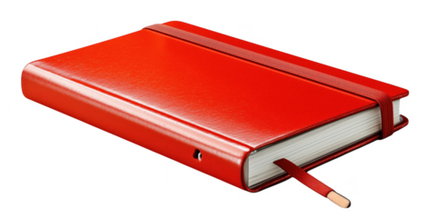 red journal with glossy leather cover, corner binding, and thick white paper stack for branding