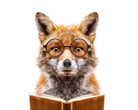 Fox animal glasses book reading cute intelligent orange fur isolated education knowledge mammal wildlife study literature humor whimsical smart focus learning wisdom portrait character creative