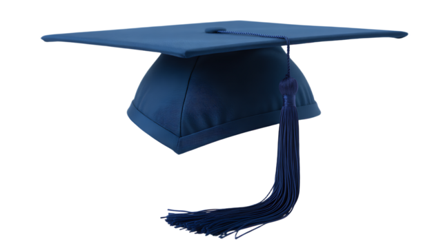 Dark blue graduation cap isolated PNG on transparent background, academic mortarboard with tassel for education and commencement
