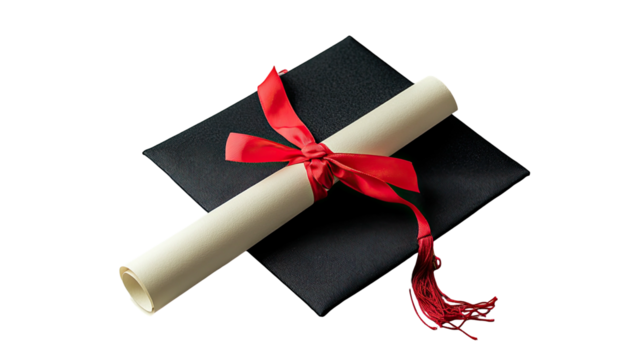 Academic mortarboard cap with golden tassel on transparent background