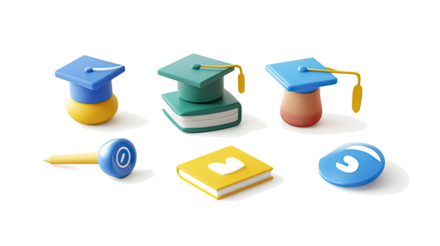 3D rendering of a blue graduation cap with golden tassel on a white background