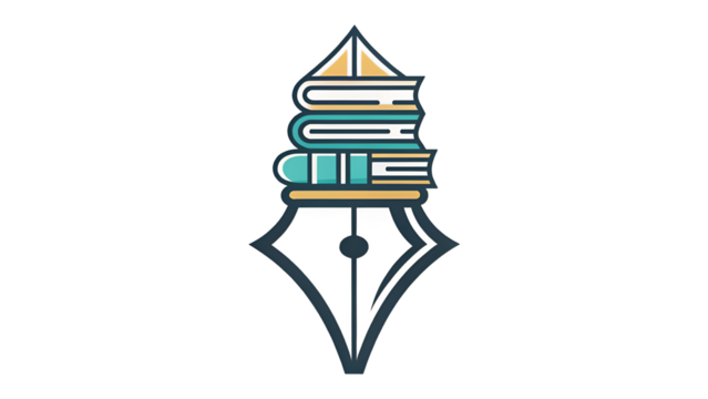 Quill pen nib illustration merged with a stack of academic books representing writing, education, and literary pursuits.