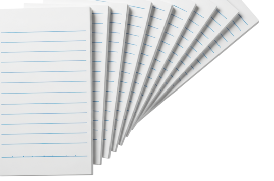 Fanned out stack of white lined notebook paper sheets for writing on a transparent background
