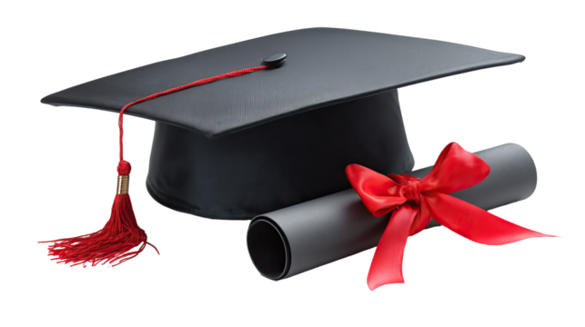 Graduation Cap with Rolled Diploma Tied with Red Ribbon Ultra High Resolution on Transparent Background