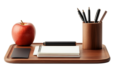 Elegant setup of a desk featuring a pen holder apple and books representing productivity creativity and professional balance isolated on transparent background PNG