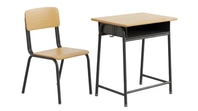 School desk and chair set for student education and learning isolated on transparent background