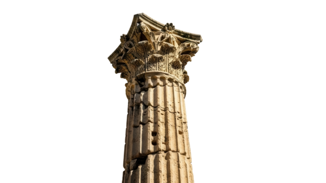 Ancient Corinthian column isolated PNG on transparent background, weathered stone pillar with ornate capital for historical architecture
