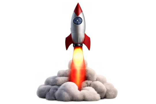 Rocket launching with fire and smoke, representing startup, success, innovation, exploration, and growth