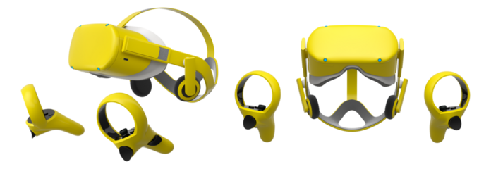 Virtual reality glasses and headset with controllers isolated on white background with clipping path. 3D render of design that enhances immersive gaming experiences for users