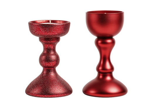 Two red metallic candle holders one with a glitter finish and one smooth isolated on a transparent background