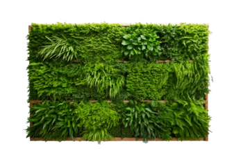 Lush, dense green vertical garden with diverse foliage like ferns and broad leaves. Vibrant red and white flowers accent the natural growth isolated transparent background