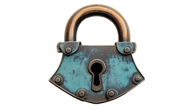Old weathered padlock protecting access on transparent background