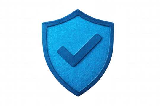 Blue shield with a check mark symbolizing security, protection, and verification on a transparent background