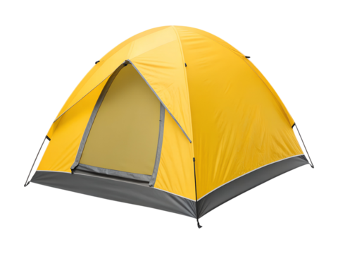 A spacious yellow dome tent with an open entrance stands ready for camping, isolated as a transparent PNG image.