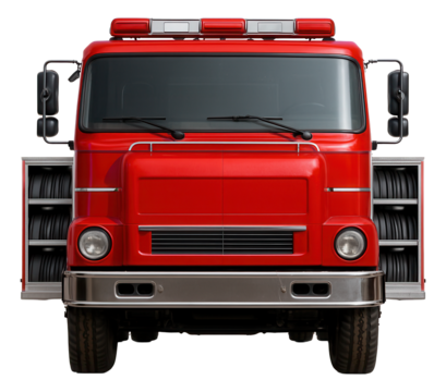 Fire vehicle featuring a spacious water tank and accessible hose storage areas.