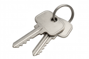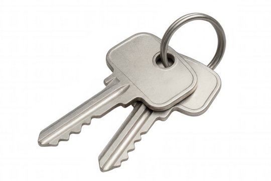 Shiny silver metal key isolated PNG, house or car key for security and access on transparent background