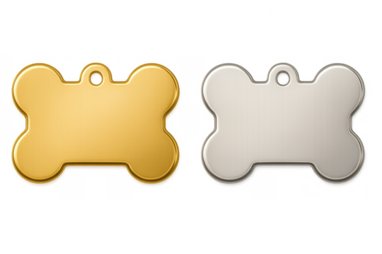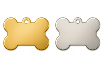 Dog bone pet tags with blank shiny metallic surface, gold and silver id accessories for animals on transparent background, adding customization