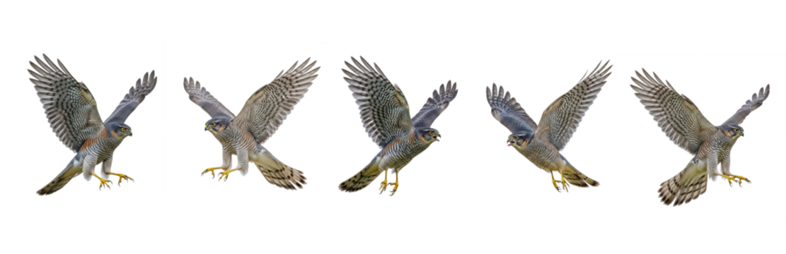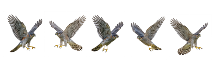 Set Of Flying Eurasian sparrowhawk (Accipiter nisus)  isolated on transparent background, PNG