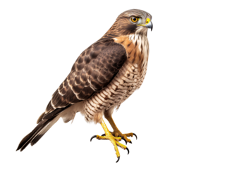 Majestic hawk soars high, showcasing its formidable wingspan against an isolated backdrop of pure white, capturing the essence of freedom