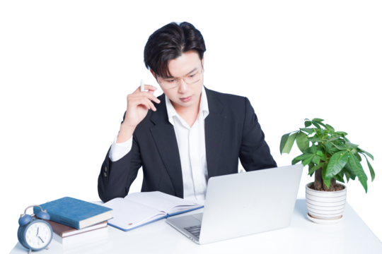 Focused Professional at Desk: A contemplative professional, engrossed in his work at a modern desk, surrounded by essential tools of the trade, embodies dedication and focus.