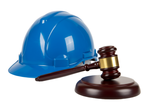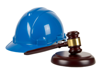 青い建設用ヘルメットと木製のハンマー法律関連のシンボル透明背景で分離
