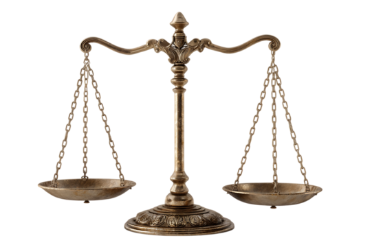 A majestic antique bronze scale of justice, symbolizing balance, fairness, and the pursuit of equitable outcomes in legal proceedings. Isolated on transparent background, cutout