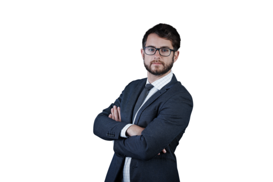 Portrait of handsome businessman in suit with crossed arms on transparent background PNG.