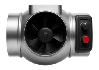 Variable speed inline duct fan with an integrated controller for greenhouse ventilation.