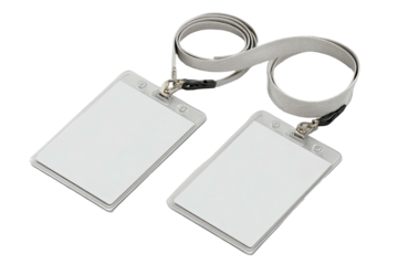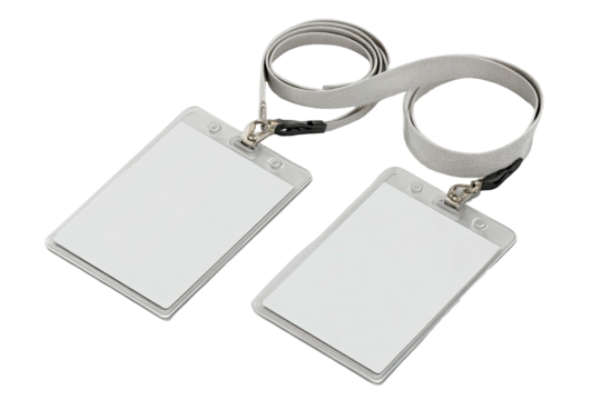 Two rectangular plastic badge holders with white inserts and attached grey lanyards, isolated on black