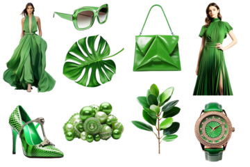 Set of green fashion aesthetic model and objects on png background. Ideal set for design and collage art.