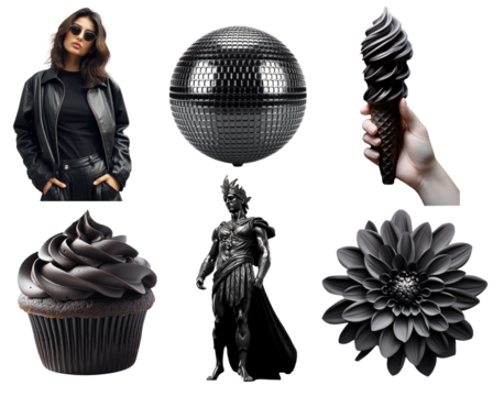 Set of black fashion accsessories and model on png background. Ideal set for design and collage art. Black aesthetic trends.