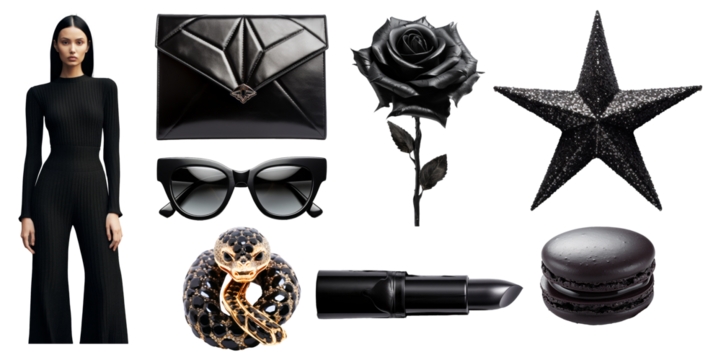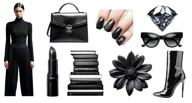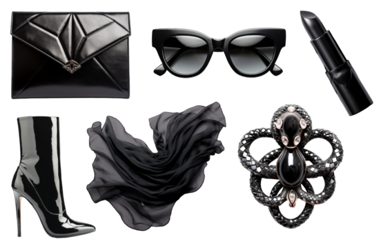 Set of black fashion accsessories on png background. Ideal set for design and collage art.