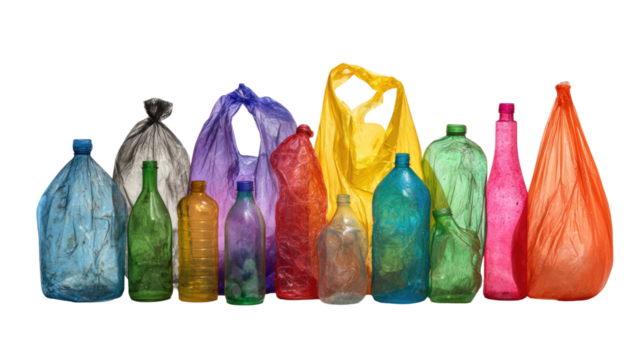 colorful mixed plastic bottles and bags waste pollution collection environmental recycling awareness plastic garbage display on white background