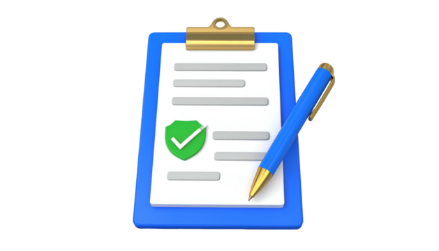 3D illustration of a clipboard with a document, checkmark, and pen on a black background