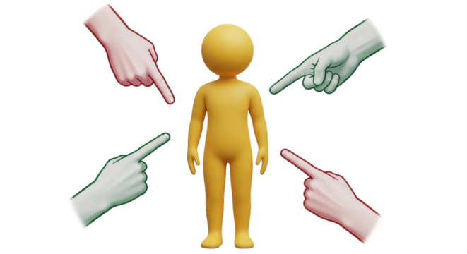 Isolated person being blamed, stick figure with hands pointing at it, guilt and responsibility