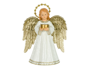 Elegant White Angel Tree Topper with Flowing Gown and Halo, Angled View, Isolated