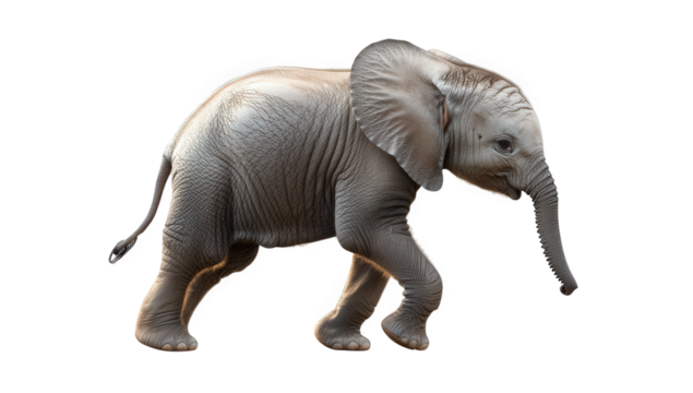 A delightful baby elephant isolated on transparent background, capturing its innocence and charm as it ambles along, showcasing its endearing features and playful spirit