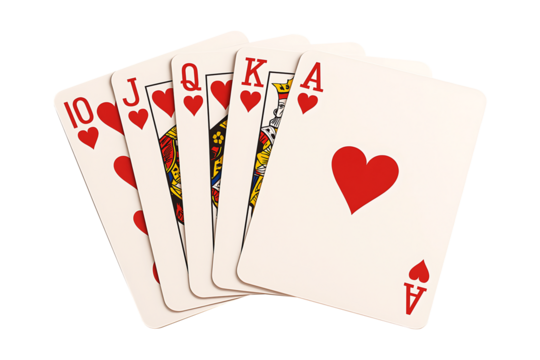 Red hearts Royal Flush poker cards spread out, isolated on white or transparent background