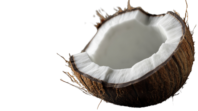 A freshly cut coconut half with the inside flesh visible, isolated on transparent background, offering a close-up of its tropical essence.