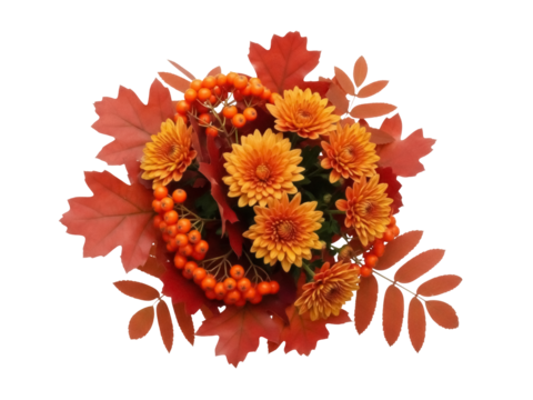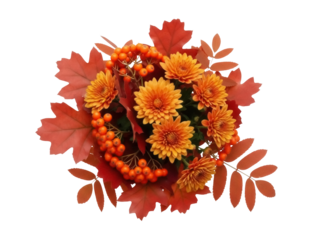 Isolated autumn bouquet of flowers, rowan berries, and red maple leaves for thanksgiving