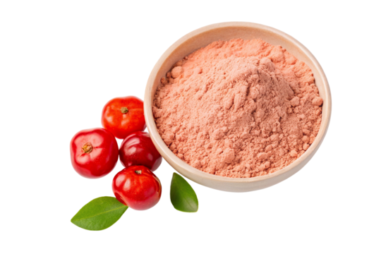Organic acerola cherry powder in bowl with fresh acerola fruit for health and wellness nutrition