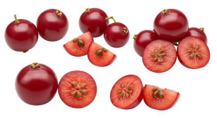 Fresh ripe red acerola cherries whole and sliced isolated on white background, healthy tropical superfruit perfect for nutrition and food projects