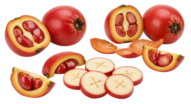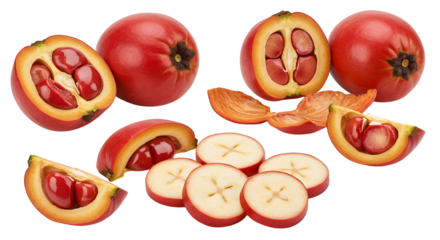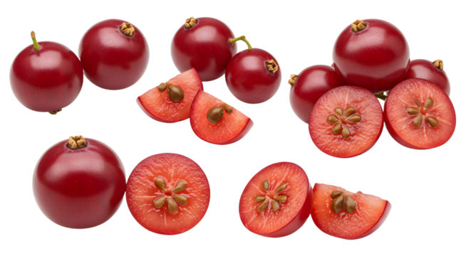 Fresh red acerola cherries whole and cut showing seeds and cross sections isolated on white background, perfect for healthy food and vitamin C concepts