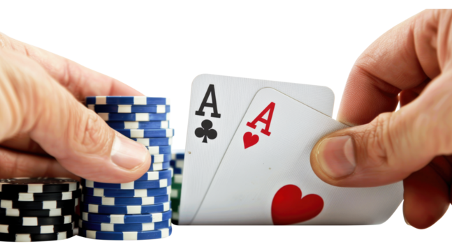 Hands holding poker chips and two aces cards isolated on transparent background.