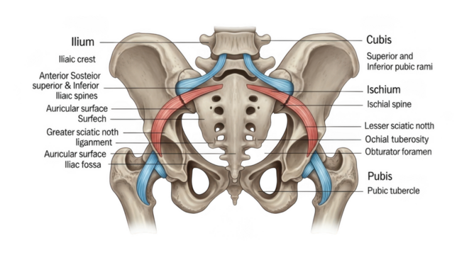 Detailed anatomical illustration of the human pelvis, showcasing bone structure and hip joints.