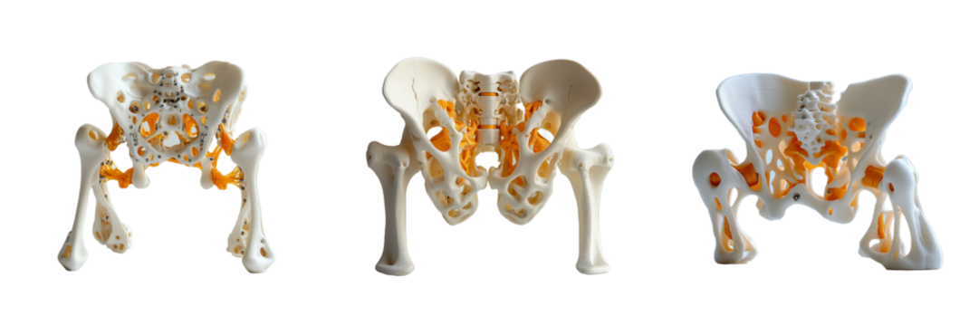 Three Dimensional Printed Model of Human Pelvis with Ligaments and Implants Detailed Anatomy Views isolated on transparent Background