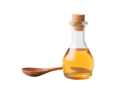Apple cider vinegar bottle with wooden spoon  isolated on white background