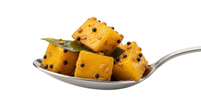 Indian mango pickle cubes with curry leaves and spices on spoon. Spoonful of mango pickle isolated on transparent background, a tangy and spicy delight