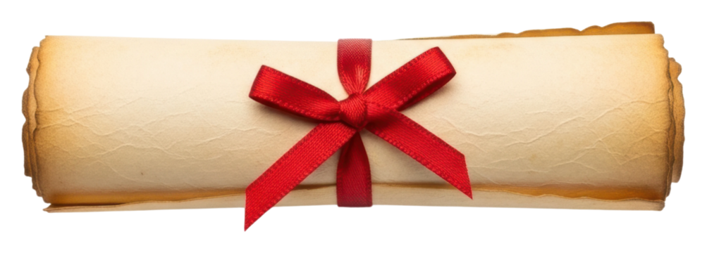 Aged paper scroll with red ribbon isolated PNG, vintage diploma or certificate on transparent background