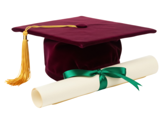 Blue graduation cap with yellow tassel and rolled diploma tied with a red ribbon, isolated on transparent background